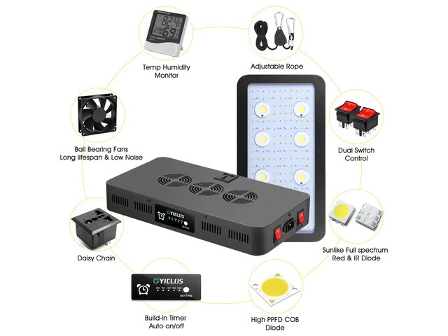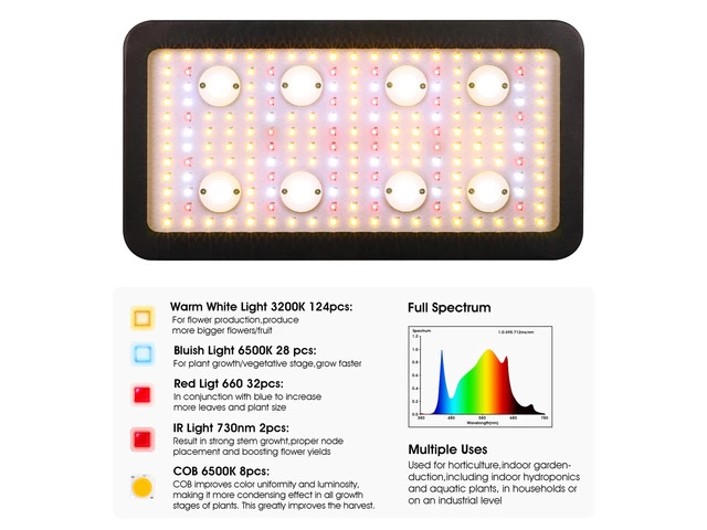 FULL SPECTRUM】3200K SMD: 116pcs 6500K SMD: 28pcs RED 660nm: 30pcs IR 730nm: 2pcs COB 6500K: 8pcs