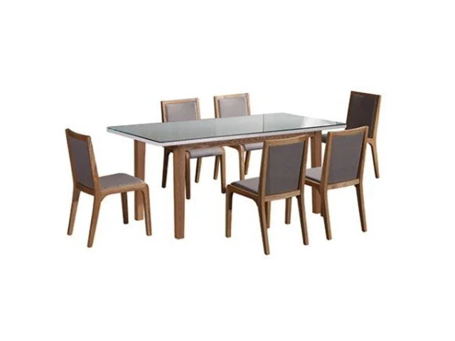 The set includes a generously sized dining table paired with six matching chairs, offering ample seating for family meals, gatherings, or casual entertaining. Each chair is thoughtfully designed to provide comfort and support, making long dinners and conversations more enjoyable. The solid wooden base adds durability and stability, ensuring the suite remains reliable for years of regular use.