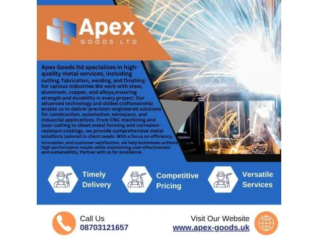Apex Goods ltd specializes in high-quality metal services, including cutting, fabrication, welding, and finishing for various industries. We work with steel, aluminum, copper, and alloys, ensuring strength and durability in every project. Our advanced technology and skilled craftsmanship enable us to deliver precision-engineered solutions for construction, automotive, aerospace, and industrial applications. From CNC machining and laser cutting to sheet metal forming and corrosion-resistant coatings, we provide comprehensive metal solutions tailored to client needs. With a focus on efficiency, innovation, and customer satisfaction, we help businesses achieve high-performance results while maintaining cost-effectiveness and sustainability. Partner with us for excellence.