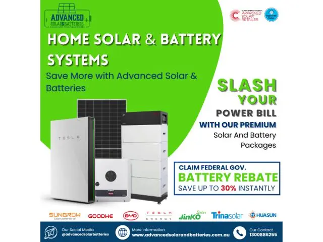 Upgrade to clean, reliable energy with Advanced Solar & Batteries! We provide custom-designed home solar battery systems, including off-grid setups and the best solar panels for homes in Australia. Enjoy lower power bills, backup during outages, and expert installation. Government rebates available. Contact us now for a free solar assessment and quote!
