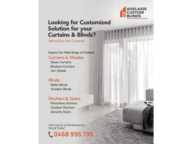 Looking for blinds and shutters in Adelaide? We supply and installation curler blinds, plantation shutters, and outdoor options made to fit your windows flawlessly. Quality materials, neat set up, and honest pricing. Free measure and quote available. Contact - +61 468 995 795 Visit - https://adelaidecustomblinds.com.au