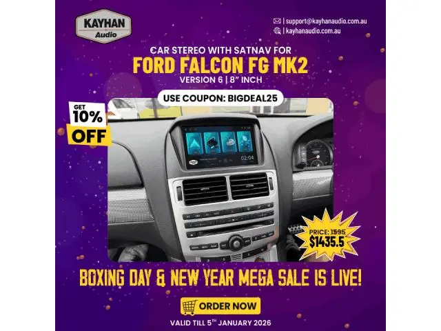 Don’t miss this limited-time upgrade for your Ford Falcon FG MK2. The Kayhan Audio Version 6 Car Stereo with SatNav features a crisp 8” touchscreen, modern infotainment, and a seamless factory-finish installation.