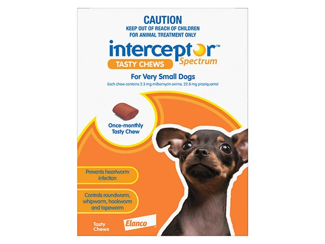 Interceptor Spectrum is an effective heartworm treatment that comes in tasty meaty chew form. The monthly treatment prevents heartworm infection. It treats immature form of Dirofilaria immitis. The tasty chew controls adult roundworm (Toxocara canis, Toxascaris leonina), immature roundworm (Toxocara canis), adult whipworm (Trichuris vulpis), adult hookworm (Ancylostoma caninum, Ancylostoma braziliense), adult tapeworm (Echinococcus granulosus, Taenia piriformis, Dipylidium caninum), and aids in the control of adult hookworm (Uncinaria stenocephala) infection. The highly palatable chew is readily accepted by dogs and protects them from harmful heartworm and intestinal worm infections.