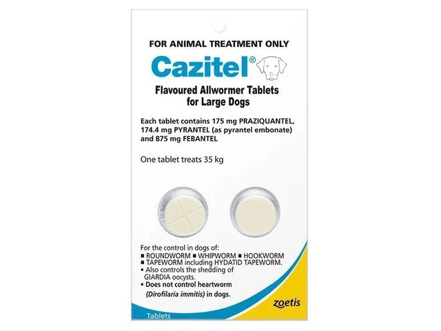 Cazitel For Dogs is a powerful broad spectrum Allwormer formulated to treat and control 12 species of gastrointestinal worms in dogs. These flavored tablets effectively destroy roundworms, hookworms, tapeworms (including hydatids) and whipworms, while also helping treat Giardia infection. With active ingredients like Praziquantel, Febantel and Pyrantel Embonate, it ensures absolute deworming and protects pets from harmful parasitic helminthes. Buy Cazitel For Dogs today to keep your furry friend healthy – Order, Purchase, Get now!