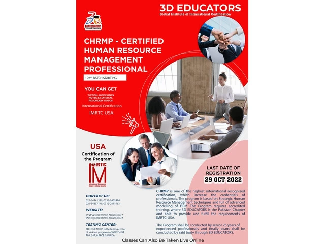 CHRMP - Certified Human Resource Management Professional, this program is to be developed for HR Professionals who may have almost more than 1-2 years of experience and would like to earn some greater credentials in their profiles. The Program has elegant features and practical experiences and exposures related to the HR Professionals and provides the complete set of Knowledge. The CHRMP Training Program in Karachi and Pakistan shall be announced by the 3D Educators Official