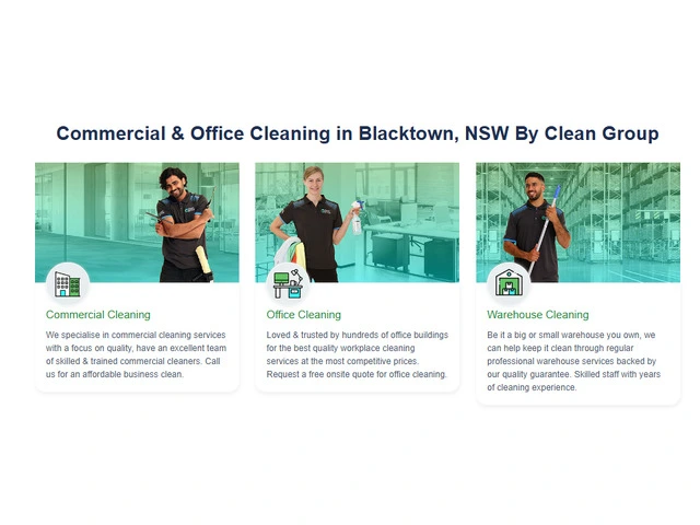 Clean Group provides top-quality commercial cleaning services in Blacktown, NSW, ensuring spotless offices, warehouses, medical centers, gyms, and more. Our expert cleaners use eco-friendly products and advanced equipment to deliver a hygienic and safe workspace. Whether you need daily, weekly, or one-time cleaning, we tailor our services to meet your business needs. Experience professional cleaning with a 100% satisfaction guarantee. Contact us today for a free quote!