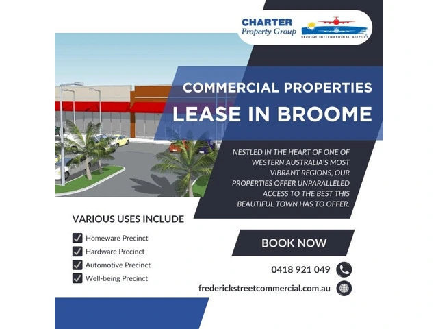 Looking to grow your business in a thriving regional hub? Explore the best commercial properties for lease in Broome with the local experts at Frederick Street Commercial. Strategically located in the heart of Broome, we specialise in connecting businesses with high-visibility retail spaces, office units, industrial warehouses, and more, suited to various industries and budgets. With in-depth market knowledge and a personalised approach, Frederick Street Commercial ensures you find the ideal space to launch, expand, or relocate your venture. For more information, contact us at 0477 550 372
