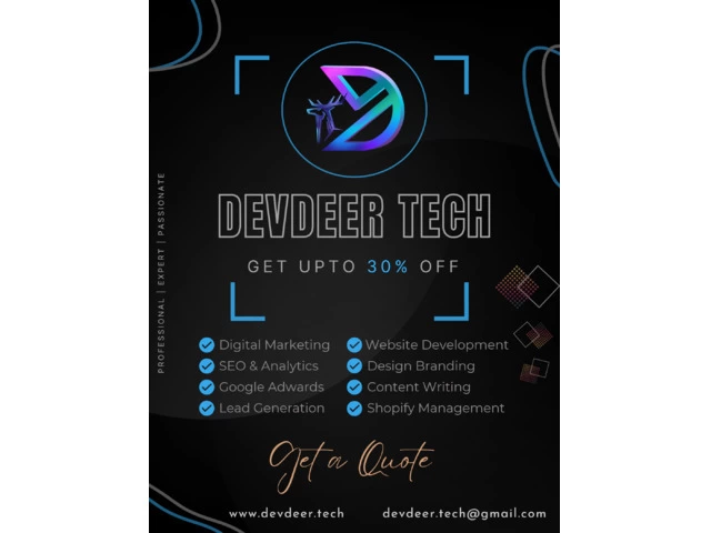 Welcome to devdeer.tech - Online Service Oriented Business Organization from which you can faithfully receive all the services online related to a business or startup. A brand is just not enough, it needs good production to stay in front of its customers. A company's success will depend on how much it invests in marketing. We provide Design-Branding, Digital Marketing, Website Development, SEO, Professional Content Writing, Lead Generation, Shopify and Third Party Services which is done in a very limited time and costs are affordable.