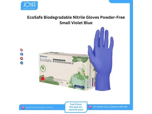 Get Ecosafe biodegradable nitrile gloves powder-free small violet blue in Australia from Joya Medical Supplies. These gloves are made of non-oxidizing biodegradable nitrile. Explore nitrile gloves today!