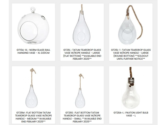 Wide range of unique glass options, including vases and bulbs