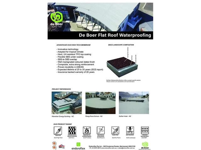 Business Description: Enduroflex are the industry leading waterproofing membrane experts. With more than 25 years experience in the construction industry, we offer a revolutionary cost effective waterproofing membrane solution which provides superior strength ensuring its reliable ability to retain complete dryness, while maintaining flexibility. This versatile material is a much preferred alternative to construction chemicals or chemical coating waterproofing, as it is simple to apply and ensures optimal productivity. We make use of high quality materials which meet international standards and expert technicians to ensure your roof is protected for many years to come.