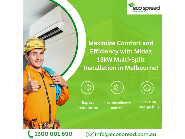 Upgrade your comfort with Ecospread Melbourne! We specialize in expert Midea 13kW Multi-Split system installations across Melbourne, Victoria, and nearby suburbs like Bendigo, Ballarat, Somerville, Geelong, and Moe. Enjoy flexible climate control and save on energy bills. Contact us today at 1300 001 690 or Info@ecospread.com.au for top-notch service!