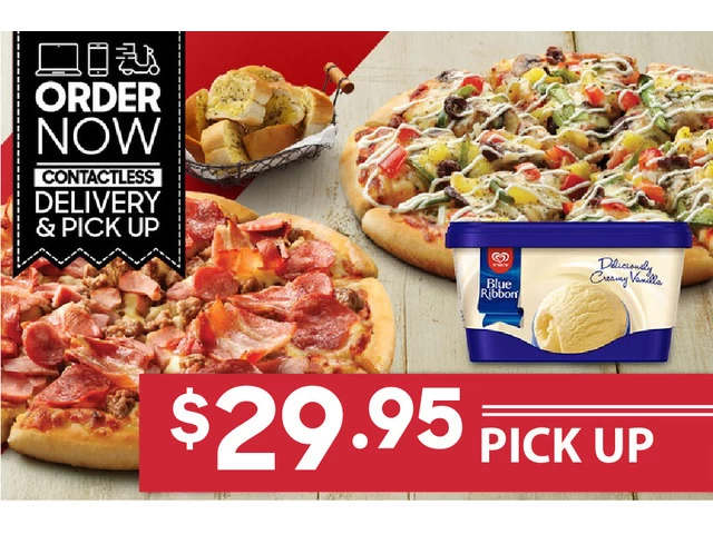 Order delicious Food Takeway online with 2 Large Pizzas + Side + Blue Ribbon Tub for $29.95 PICK UP