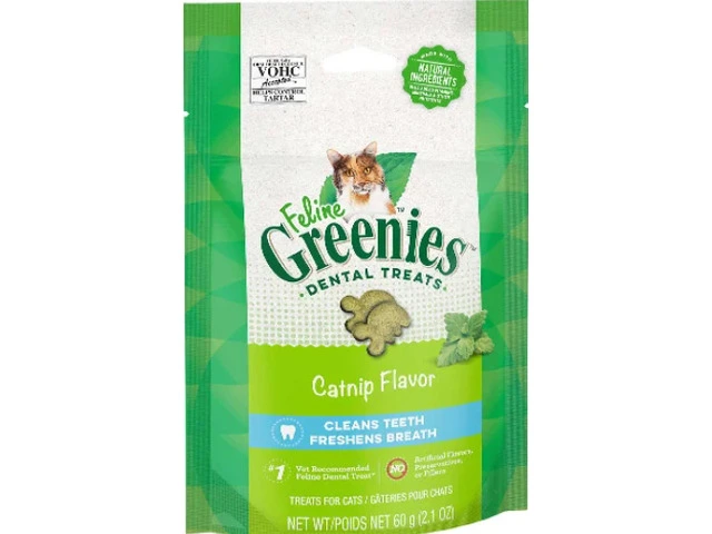 Greenies Dental Treats Catnip Flavour for Cats is special catnip flavoured treats for cats. It is designed to help reduce plaque and tartar build-up. Greenies dental chews are highly vet recommended treats for dental health. The crunchy texture encourages chewing and removes tartar and plaque build-up. Daily chewing helps to prevent tartar formation and keeps teeth clean. It not only strengthens teeth but also cleans and maintains gums.