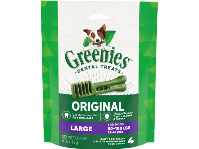 Greenies Dental Chews are expertly formulated treats for the total oral hygiene of large dogs (22-45 kg). The scientifically proven formula provides a great deal of oral health benefits, along with healthy skin and hair. The one-time chew offers a four-in-one solution for oral health care: it inhibits tartar buildup, reduces plaque buildup, stops bad breath, and helps maintain healthy gums. With fewer calories, these dental dog treats address the growing problem of canine obesity.