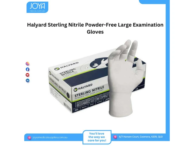 Buy Halyard sterling nitrile powder-free large examination gloves in Australia from Joya Medical Supplies. Halyard health’s manufacturing process boosts the tensile strength of nitrile–the force required to break through the glove–to increase its already superior barrier protection qualities.