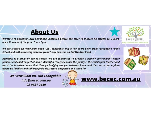 At Bountiful Childhood Education Centre, we are a leading early education centre Toongabbie whose primary mission is to create a merry, resilient ambiance for pre-schoolers. We focus more on diversity and inclusion than anything else we aim to make our childcare vibrant, which serves as the driving force behind our childcare near Constitution Hill.