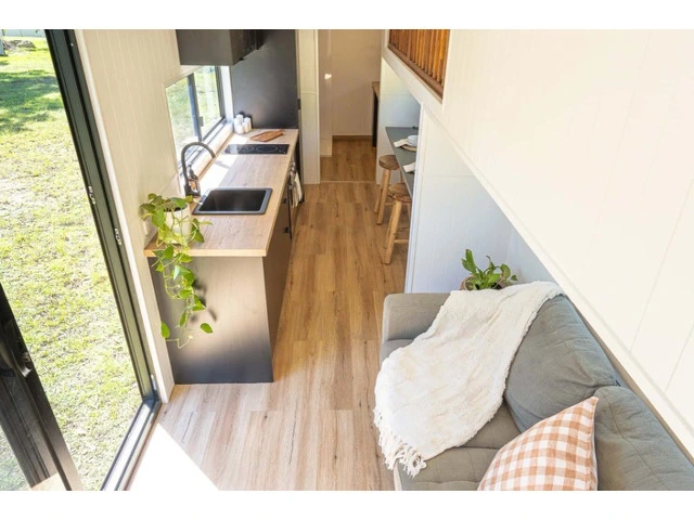 The Maple 9.0 redefines comfortable living in a Tiny Home, offering a full-sized, ground-floor bedroom, a stylishly efficient kitchen, and a cleverly arranged layout that maximises space and natural light.