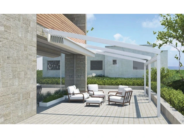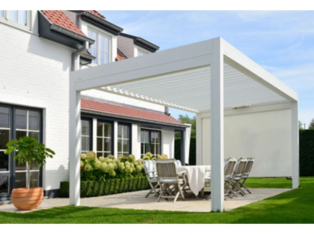 patio conservatory awnings, external motorised sunscreens, waterproof retractable pergolas, operable louvre pergolas.