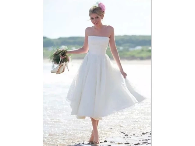 A tea length wedding dress falls to about mid-calf. This length is very popular at the moment, both on and off the catwalk. Giving a contemporary look they suit beach weddings, garden weddings or other less traditional styles.