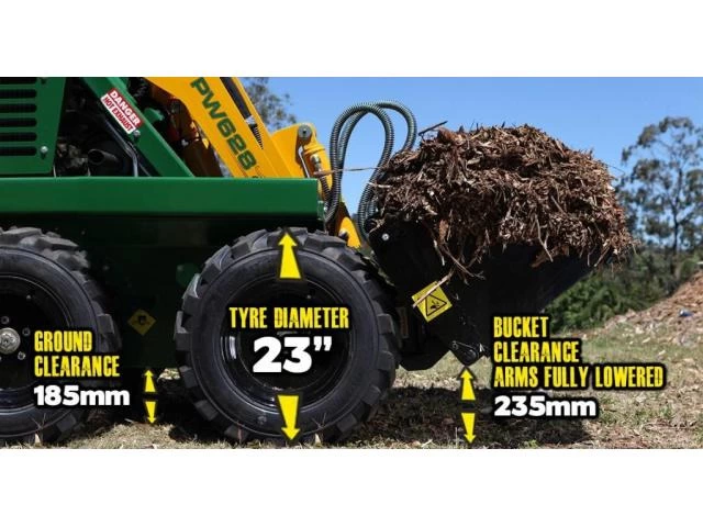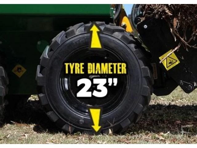Kanga tyres are designed for longevity, Kanga have engineered this concept further than any other manufacturer and have developed a design that incorporates huge 23″ tyres offering many advantages over machines fitted with smaller wheels. Think like a 4WD vs a Barina- the Kanga has the best ground clearance allowing it to clear obstacles like jumping a gutter and deeper mud without the base pan of the loader bottoming out and becoming bogged. The larger tyre diameter means that the machine has a larger surface contact with the ground allowing more torque (pushing power).