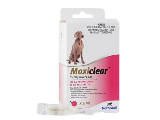 Moxiclear for Over 25kg dogs treats and controls sarcoptic mange, ear mites, and lice.