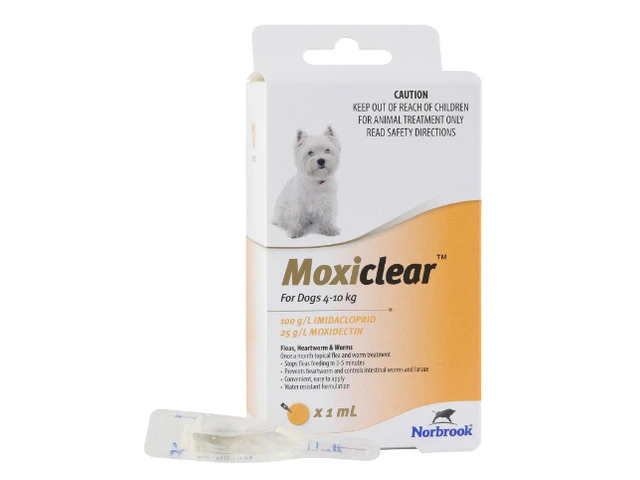 Moxiclear for 4-10kg dogs treats and controls sarcoptic mange, ear mites, and lice.