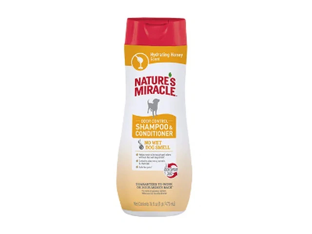 Nature's Miracle Odour Control Shampoo & Conditioner Hydrating Honey is a 2-in-1 shampoo and conditioner that aids in removing tough dog smells. The formula neutralises strong odours and moisturises coats. It contains a light, hydrating honey scent that freshens coats and leaves your dog smelling nice and clean after every wash.