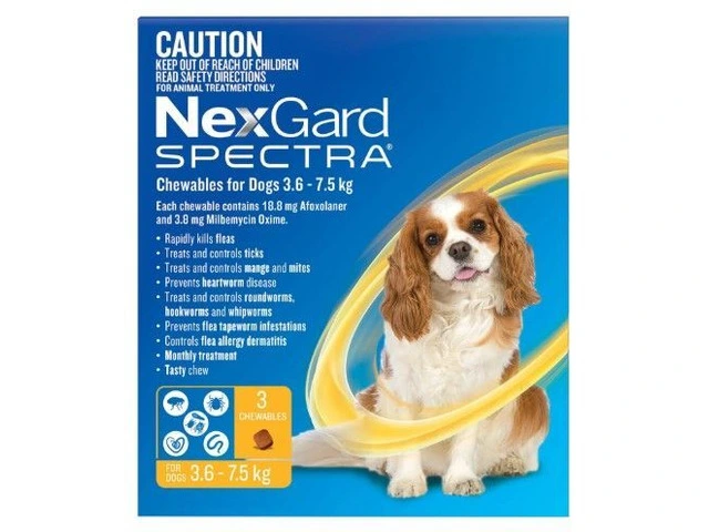 Protect your pet with NexGard Spectra Small Dog (3.6–7.5kg) Yellow. This all-in-one treatment safeguards against fleas, ticks, heartworm, and intestinal worms. Easy-to-administer, monthly chew for complete protection. Keep your small dog happy and healthy with NexGard Spectra!