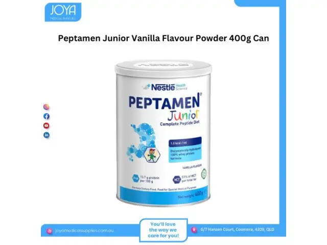 Get Peptamen junior vanilla flavour powder 400g can in Australia at Joya Medical Supplies. Nestle peptamen junior powder is a nutritionally balanced, peptide-based enteral formula for children aged 1-10 years, for the dietary management of gastrointestinal impairment.