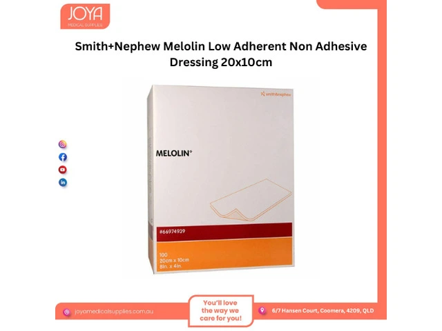 Get Smith+Nephew Melolin low adherent non-adhesive dressing 20X10cm from Joya Medical Supplies. Melolin dressing consists of a highly absorbent cotton and acrylic fibre pad which is heat bonded on one side to a very thin perforated polyester film.