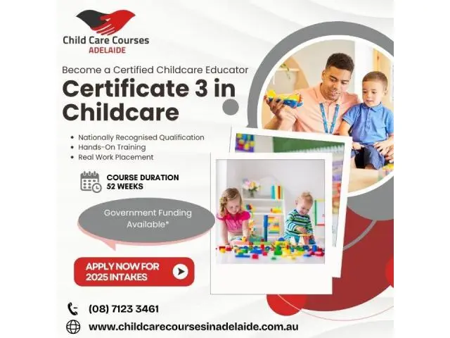 Begin your journey toward a rewarding career in childcare with Certificate 3 in Childcare in Adelaide. This nationally recognised course equips you with the essential skills to support children's learning and development in early years settings. With hands-on training and expert guidance, you’ll be job-ready in no time. Perfect for those passionate about shaping young minds, this course sets the foundation for future growth in Early Childhood Education Adelaide.