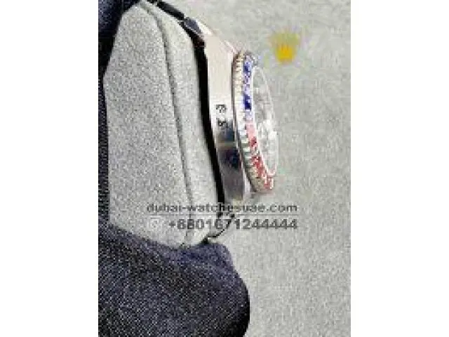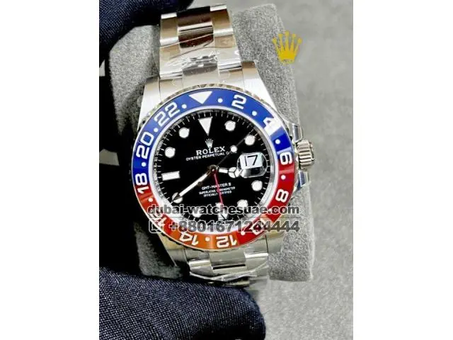 The Rolex GMT-Master II “Pepsi” replica super clone is one of those well-known watches whose outline and color way are promptly identifiable by any replica watch collector. The blue and red color bezel with the black color dial of the original Rolex GMT Master Watch is perfect for any sophisticated pilots and international travellers.