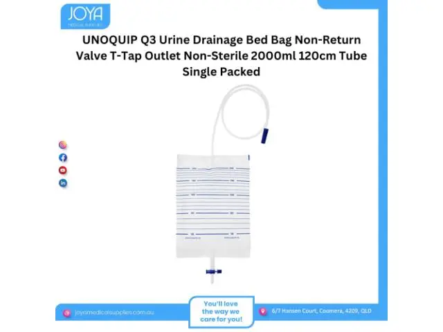 Get Unoquip q3 urine drainage bed bag non-return valve t-tap outlet non-sterile 2000ml 120cm tube single packed in Australia at Joya Medical Supplies. Unoquip non-sterile urine drainage bags are intended for the collection of urine output. Buy now!