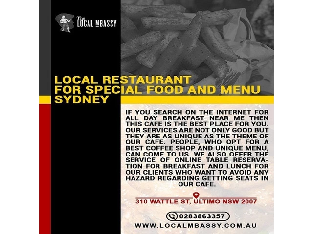 If you want to get the best restaurant in your locality where all food safety is maintained, and the staffs of the restaurant are following COVID-19 safety, you have to enter The Local Mbassy. If you are a resident of Sydney, it is the food-heaven for you. It is a Local Restaurant for Special Food and Menu in Sydney for you. If you want a Local Restaurant for Breakfast and Lunch in Sydney, this restaurant is second to none. The cook of the restaurant is highly experienced in creating excellence in tasty food. So, call us to book your seat now. Enjoy the best here. Our contact number is 0283863357.