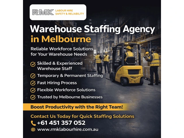 RMK Labour Hire provides reliable and professional Warehouse Staffing Agency in Melbourne customized to your business requirements. Our warehouse staff is skilled, trained, and dependable when it comes to picking, packing, loading, and inventory management. We offer flexible staffing solutions for both short- and long-term assignments. RMK Labour Hire aims to keep your operations running smoothly by ensuring quality, punctuality, and productivity. Our workforce solutions increase productivity and reduce downtime by understanding industry demands. We are trusted by warehouse staffing companies because of our commitment to excellence. Contact RMK Labour Hire for the right workforce for your company today