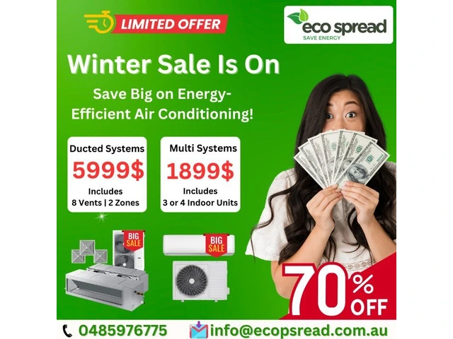 Eco Spread is offering unbeatable winter discounts on energy-efficient air conditioning systems. Get ducted systems starting at $5999 with 8 vents and 2 zones, or multi split systems from $1899 with 3 or 4 indoor units. Limited time offer—save big while staying warm this winter. Contact us today at 0485 976 775 or info@ecospread.com.au.