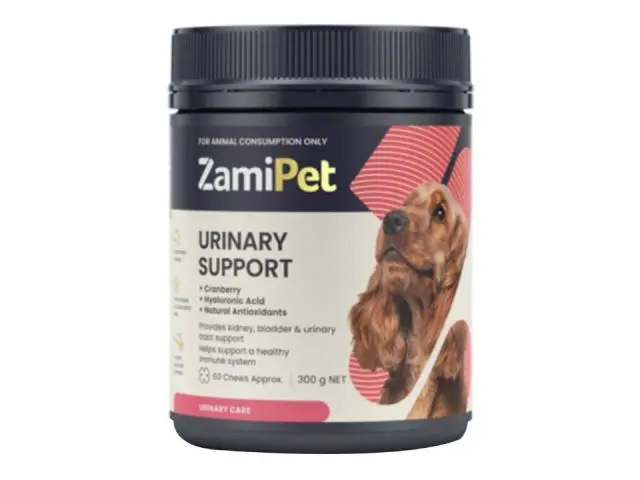 ZamiPet Urinary Support Dog Chew is an Australian-made supplement for maintaining your dog’s urinary health and immunity. It comes in the form of tasty, salmon-flavoured, chewable tablets that dogs enjoy. These chews provide nutrients that are essential for the optimum functioning of a dog’s kidney, bladder, and urinary tract. They also help prevent urinary tract infections (UTIs) in dogs when given regularly. ZamiPet Urinary Support Chews are formulated using ingredients like cranberry and hyaluronic acid that are highly beneficial for urinary care in dogs.